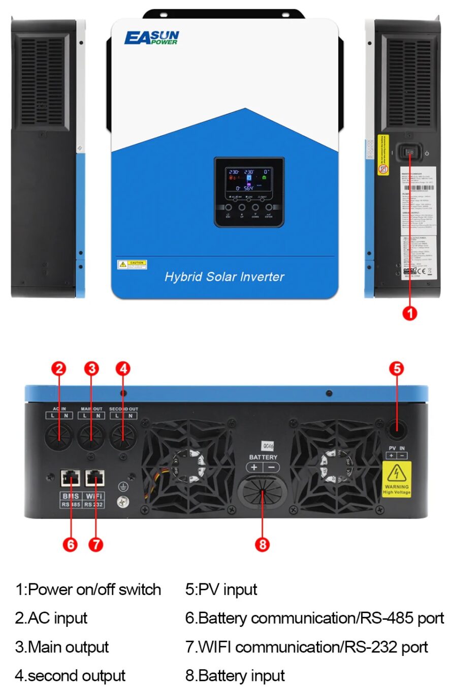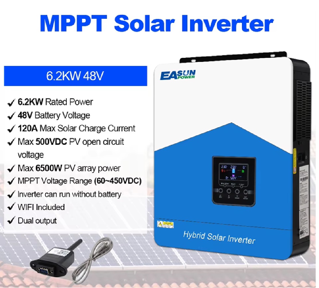 6,2KW Υβριδικός Ηλιακός Μετατροπέας 48V 230V 120A Ελεγκτής φορτιστή MPPT διπλής εξόδου Max PV 500V Pure Sine Wave With WIFI και BMS Σημείωση: Ο μετατροπέας περιλαμβάνει WiFi, το οποίο μπορεί να συνδεθεί με παρακολούθηση εφαρμογής κινητού τηλεφώνου Χαρακτηριστικά: